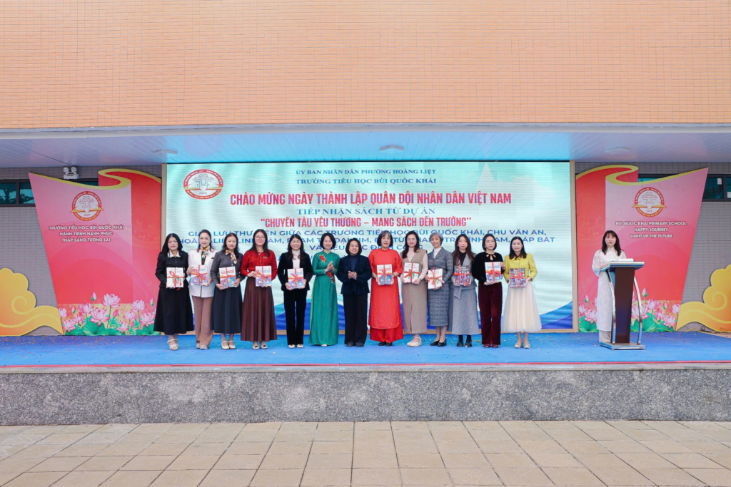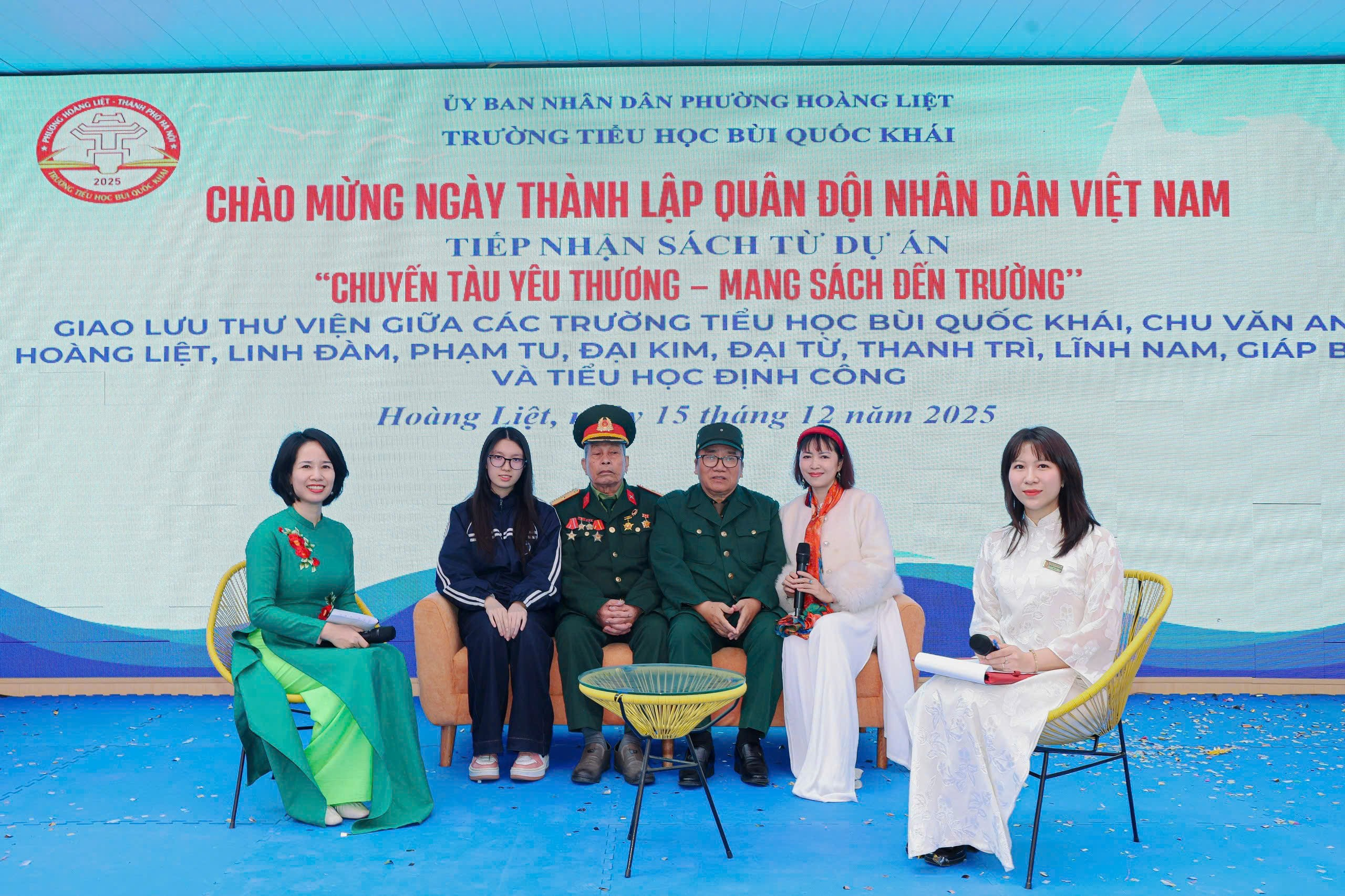 Hòa chung không khí thi đua sôi nổi chào mừng Ngày thành lập Quân đội Nhân dân Việt Nam (22/12), sáng ngày 15/12/2025, Trường Tiểu học Bùi Quốc Khái đã trang trọng tổ chức chương trình chào mừng Ngày thành lập Quân đội Nhân dân Việt Nam, tiếp nhận sách từ dự án “Chuyến tàu yêu thương – Mang sách đến trường” kết hợp giao lưu thư viện giữa các trường tiểu học trên địa bàn phường Hoàng Liệt; phường Định Công; phường Thanh Liệt và phường Lĩnh Nam