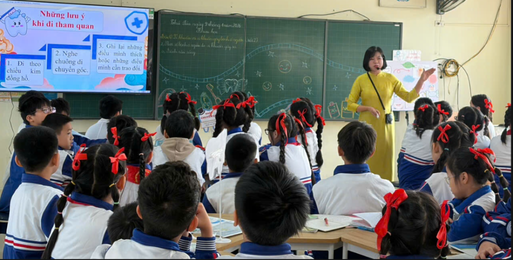Cô giáo Nguyễn Thị Minh Hương cùng học sinh trong tiết dạy Khoa học tại trường Tiểu học Chu Văn An.