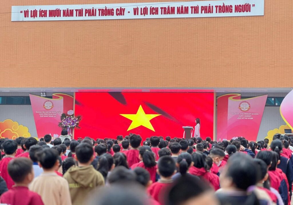 Tiếp theo chương trình, toàn thể cán bộ, giáo viên, nhân viên và các em học sinh thực hiện nghi lễ chào cờ, thể hiện niềm tự hào của thầy trò nhà trường.