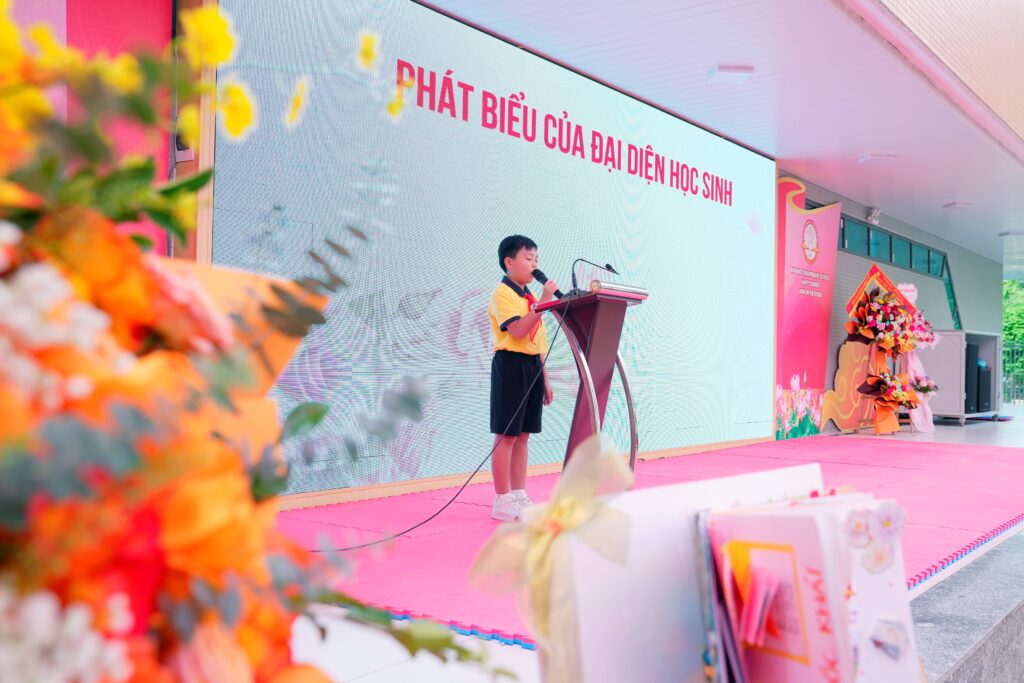 Đại diện học sinh toàn trường em Nguyễn Như Thế Kiệt lớp 5A1 cũng có bài phát biểu đầy tình cảm, bày tỏ lòng biết ơn đối với những người thầy thầm lặng đã nâng bước các em mỗi ngày. Những lời chia sẻ chân thành ấy đã góp phần làm buổi lễ trở nên ấm áp và ý nghĩa hơn.