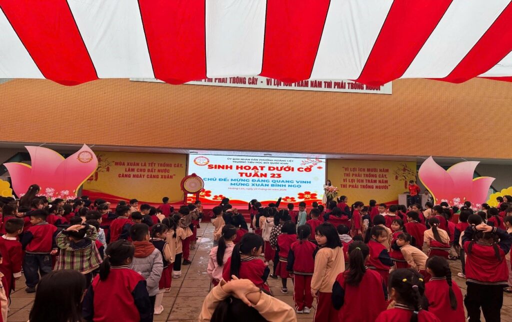 Ngay từ đầu giờ chào cờ của năm mới Bính Ngọ các con học sinh đã đứng ngay ngắn để dự lễ chào cờ đầu tuần. Toàn thể 34 lớp học đã tổ chức nghi lễ chào cờ long trọng, các em học sinh đồng thanh hát vang Quốc ca với giọng hát hồn nhiên, trong trẻo, thể hiện niềm tự hào và tình yêu quê hương, đất nước. Không khí thiêng liêng ấy đã thắp lên trong mỗi trái tim tình yêu quê hương, đất nước và ý thức trách nhiệm của một công dân nhỏ tuổi, sẵn sàng cho một tuần học tập và rèn luyện hăng say.